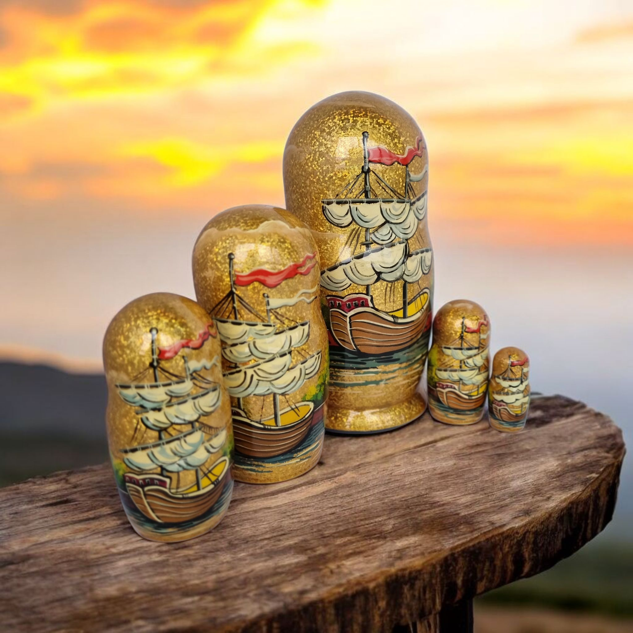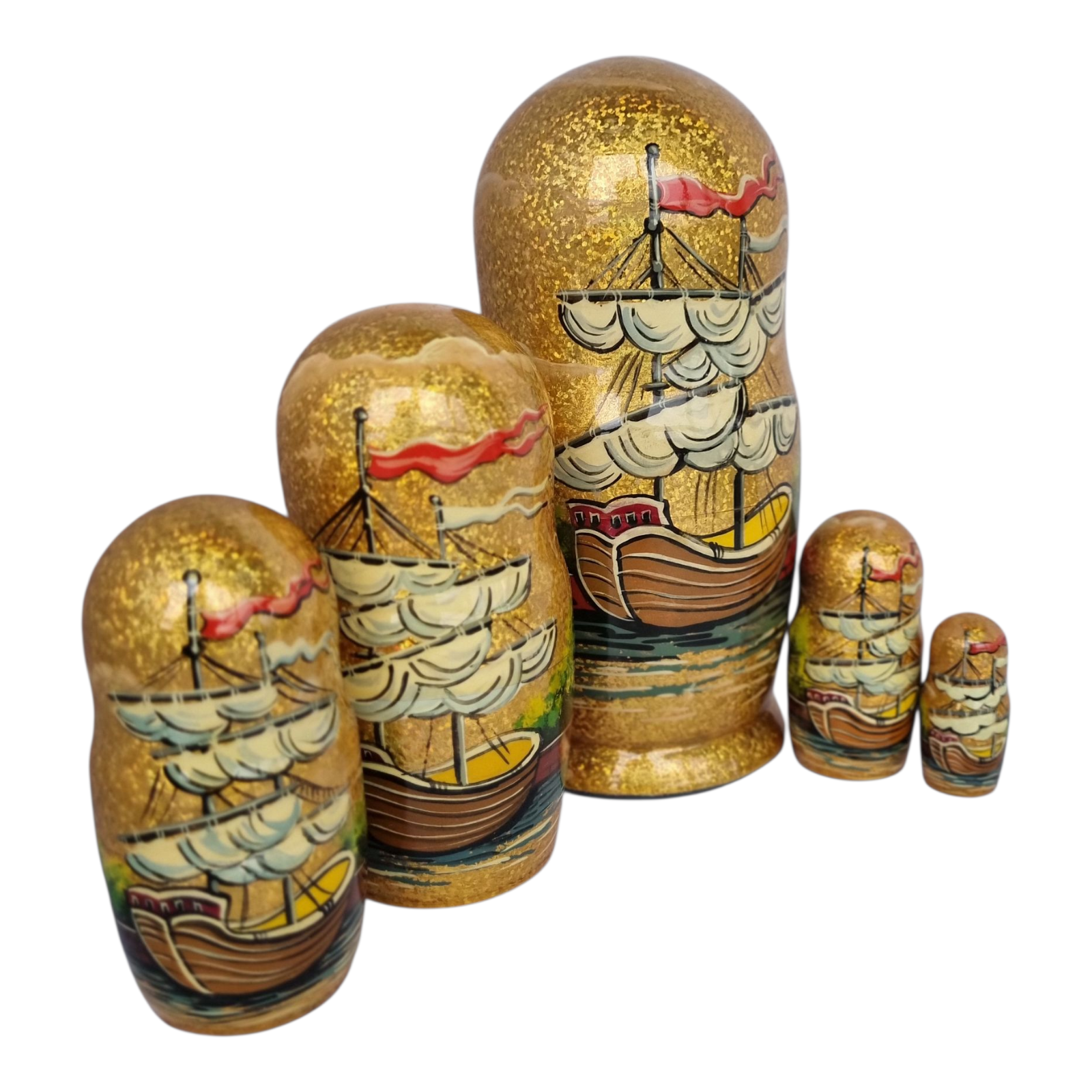 Матрешка "Санкт-Петербург" с видами города, форма прямая, 5 местная матрешка, высота 1й - 18см, ручная роспись, ручная работа, выполнена темперными красками с элементами поталевого золочения, заготовка выполнена из липы, лаковое покрытие.