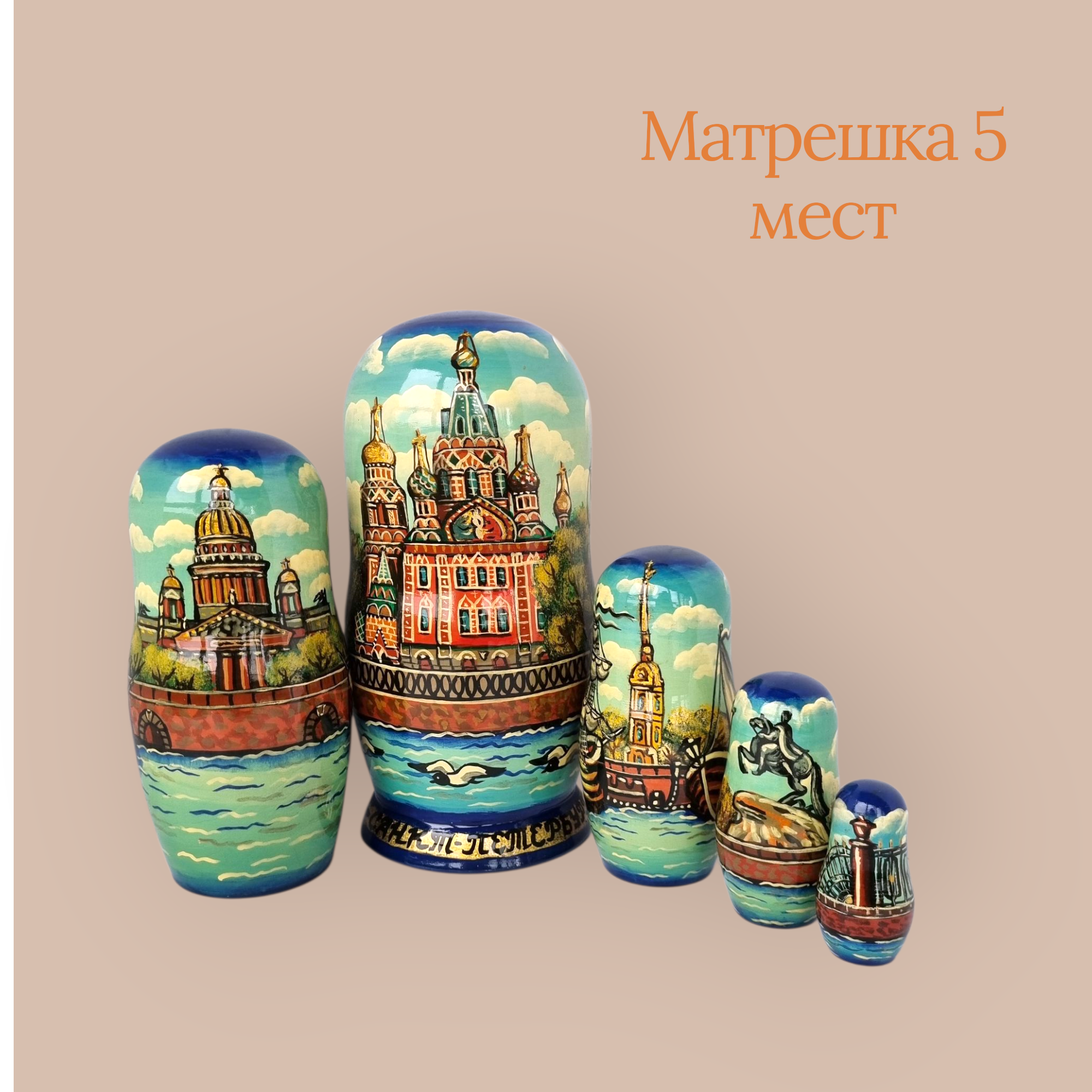 Матрешка "Санкт-Петербург" с видами города, форма прямая, 5 местная матрешка, высота 1й - 18см, ручная роспись, ручная работа, выполнена темперными красками с элементами поталевого золочения, заготовка выполнена из липы, лаковое покрытие.