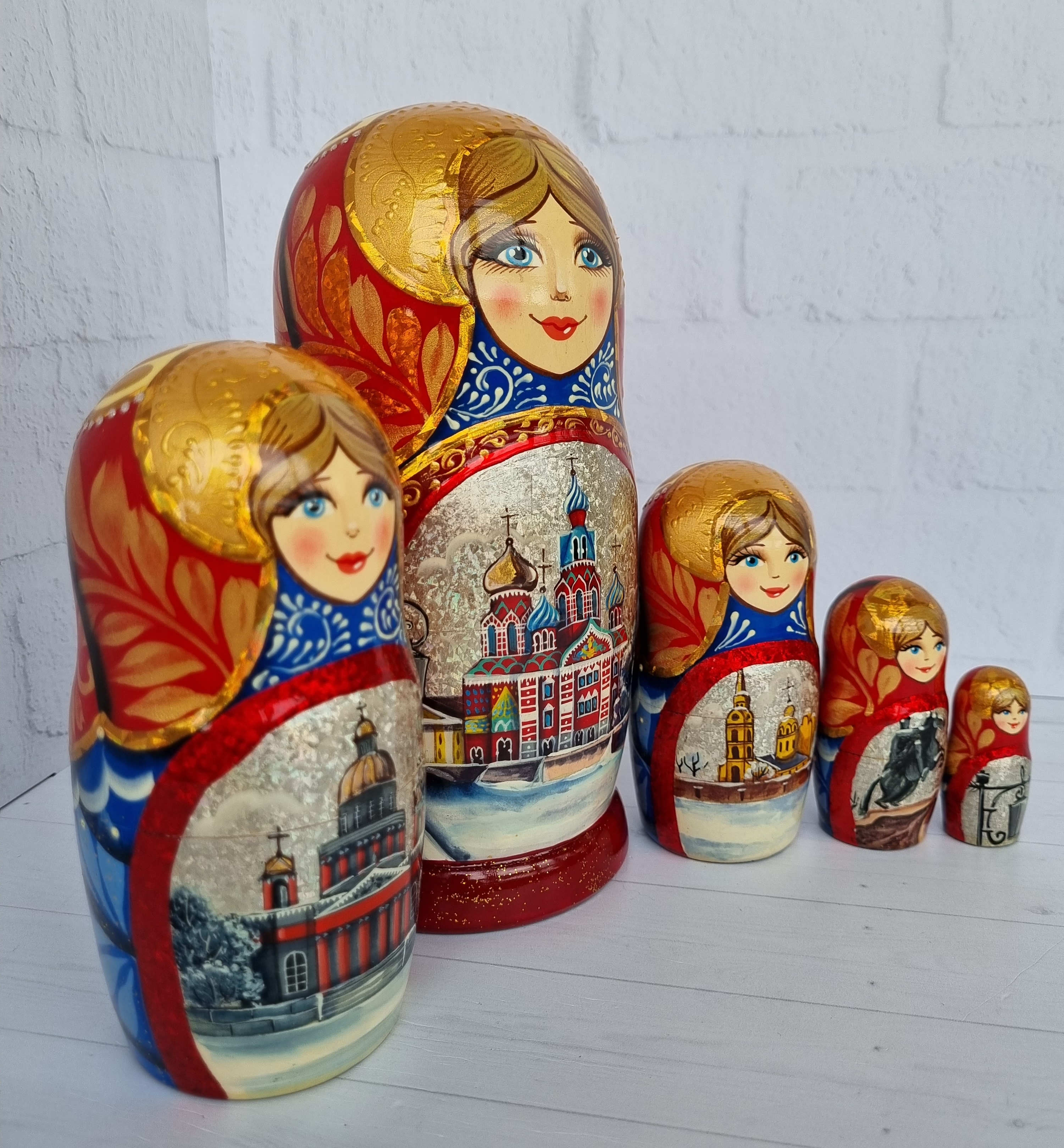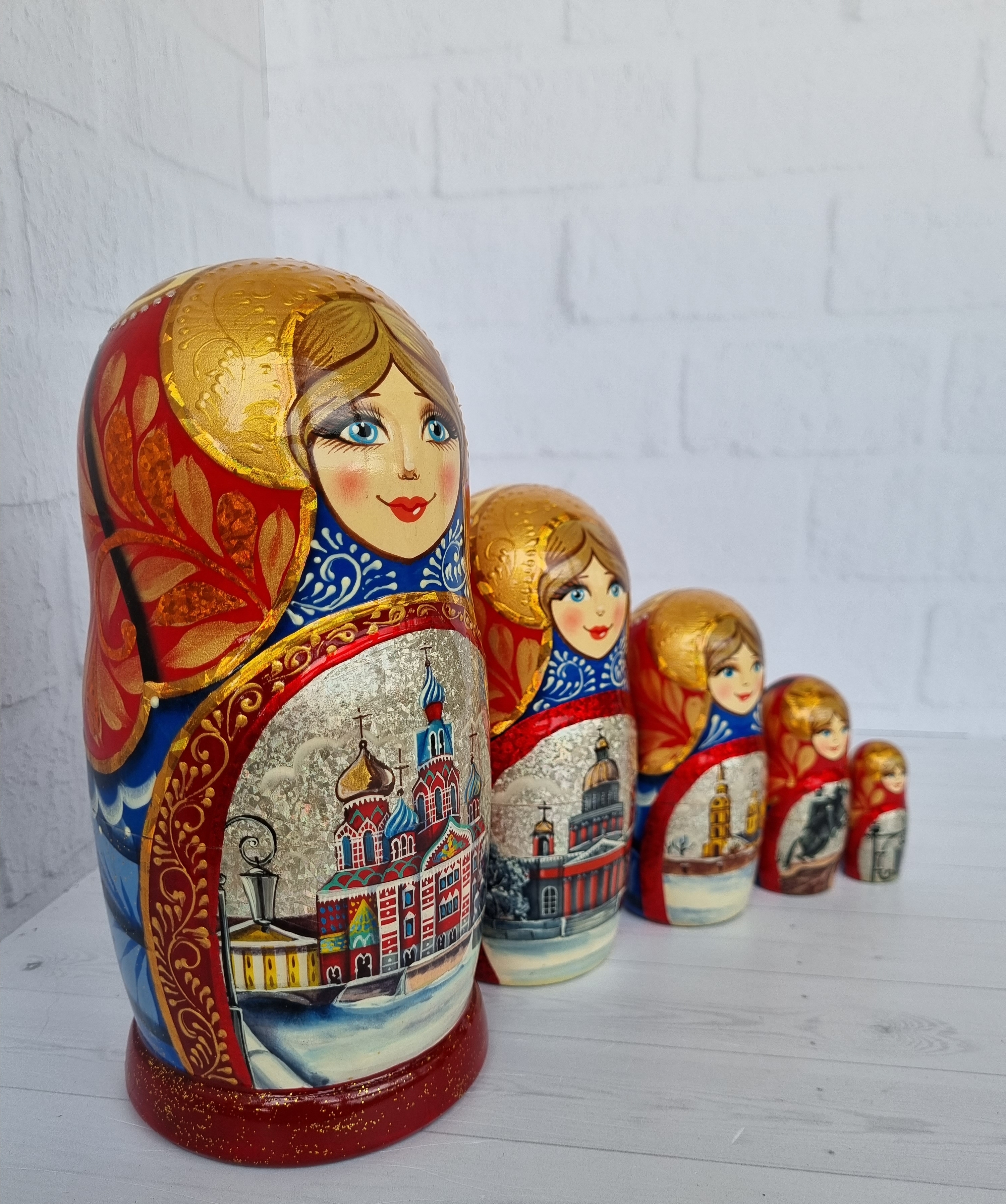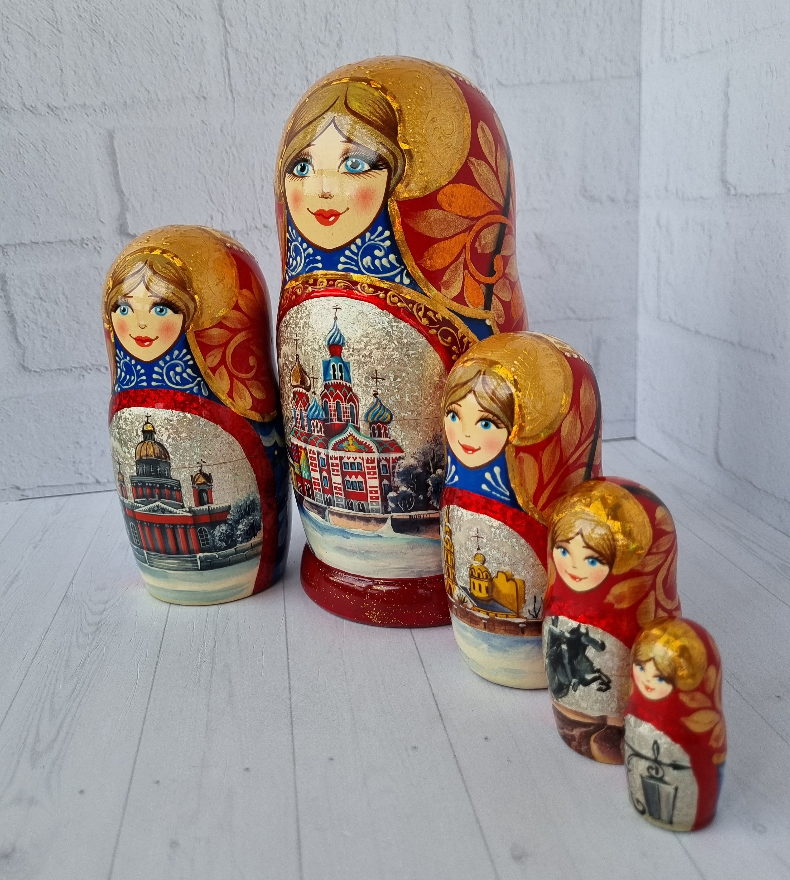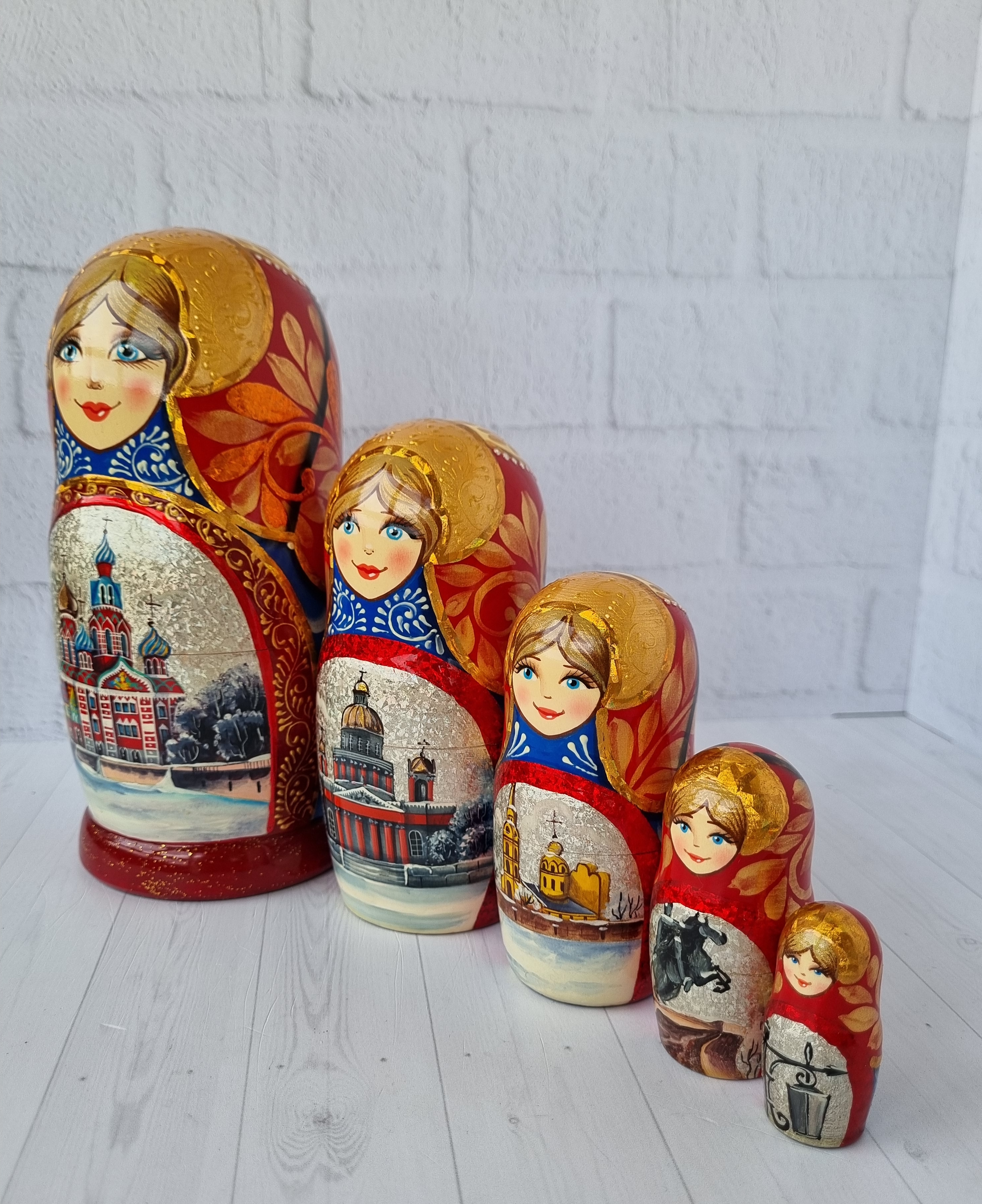 Матрешка "Санкт-Петербург" с видами города, форма прямая, 5 местная матрешка, высота 1й - 18см, ручная роспись, ручная работа, выполнена темперными красками с элементами поталевого золочения, заготовка выполнена из липы, лаковое покрытие.