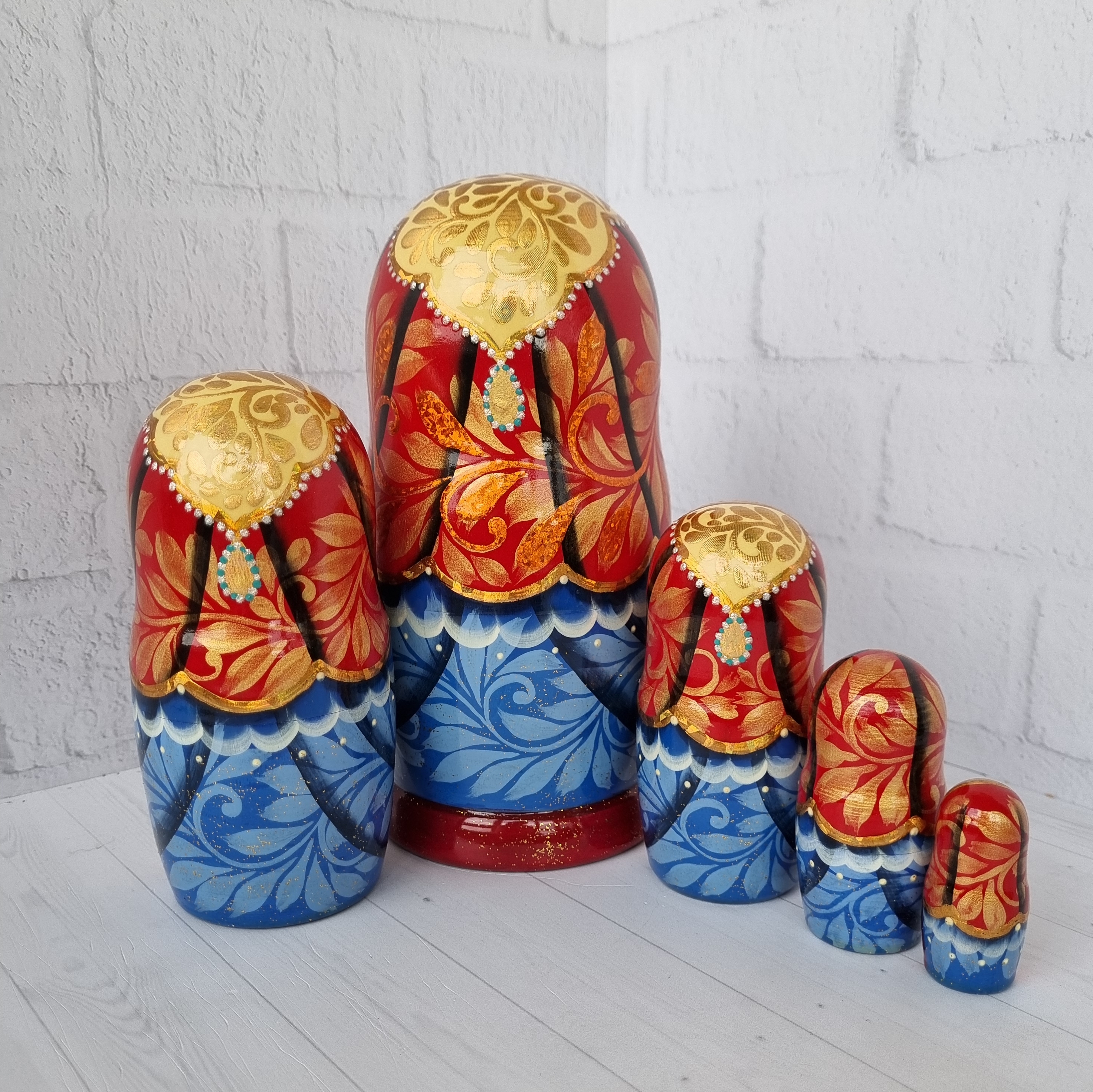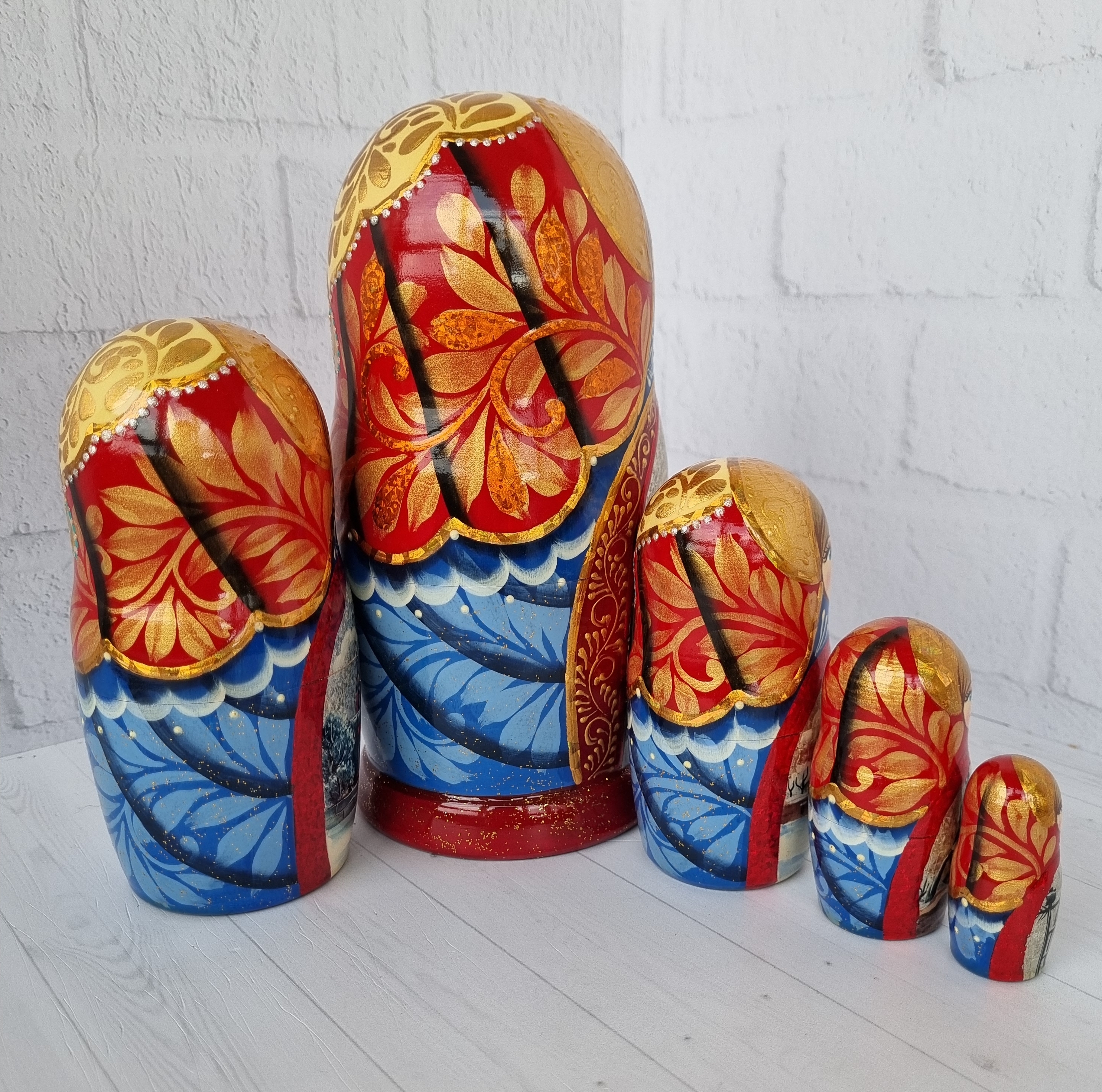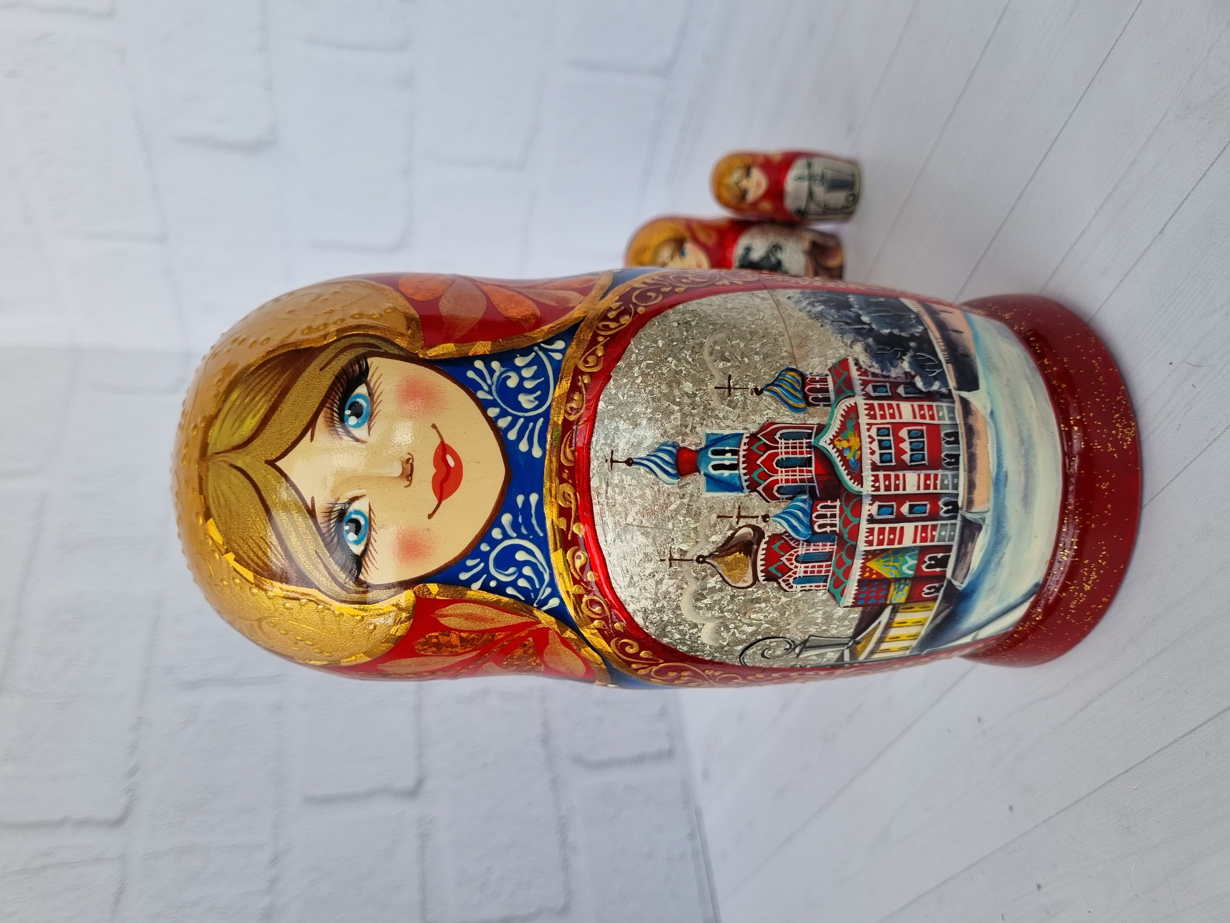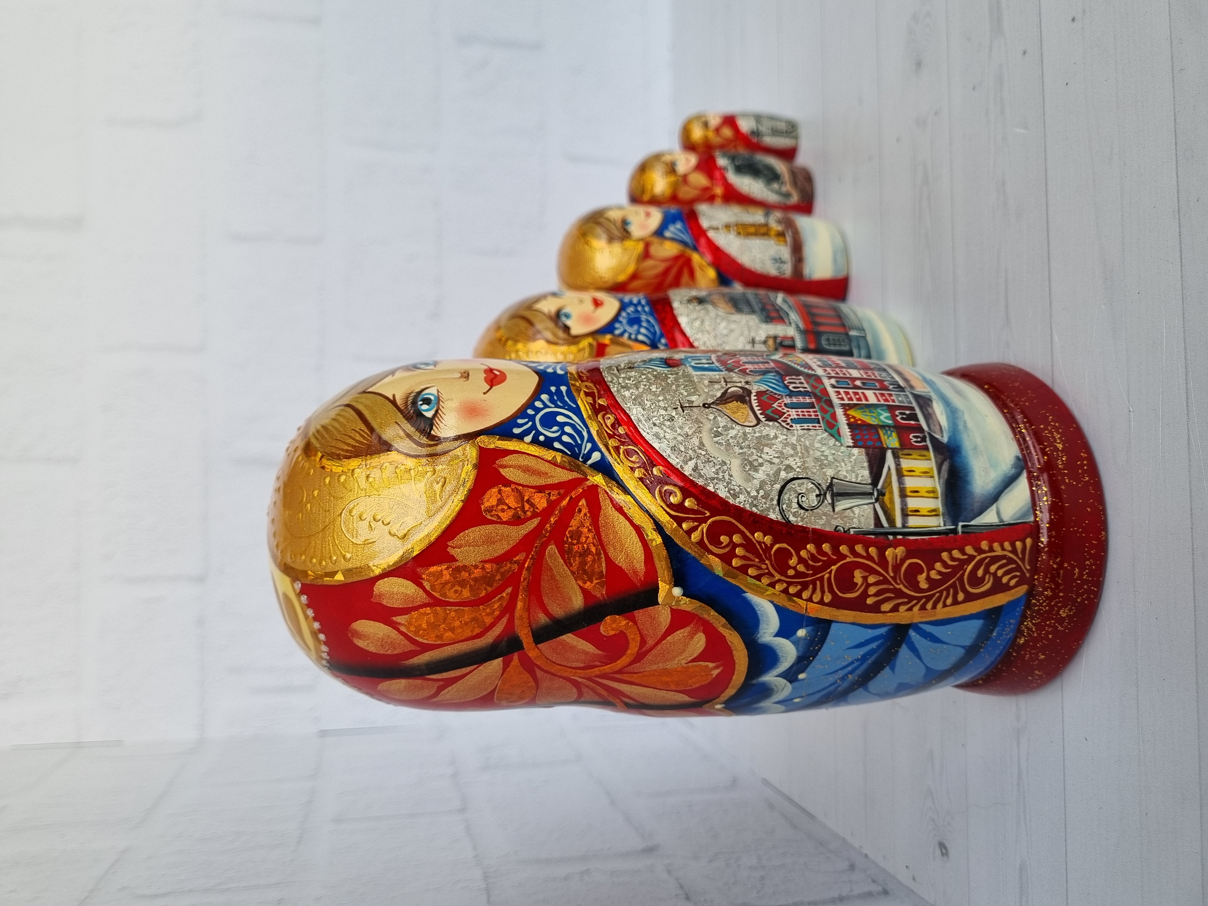 Матрешка "Санкт-Петербург" с видами города, форма прямая, 5 местная матрешка, высота 1й - 18см, ручная роспись, ручная работа, выполнена темперными красками с элементами поталевого золочения, заготовка выполнена из липы, лаковое покрытие.