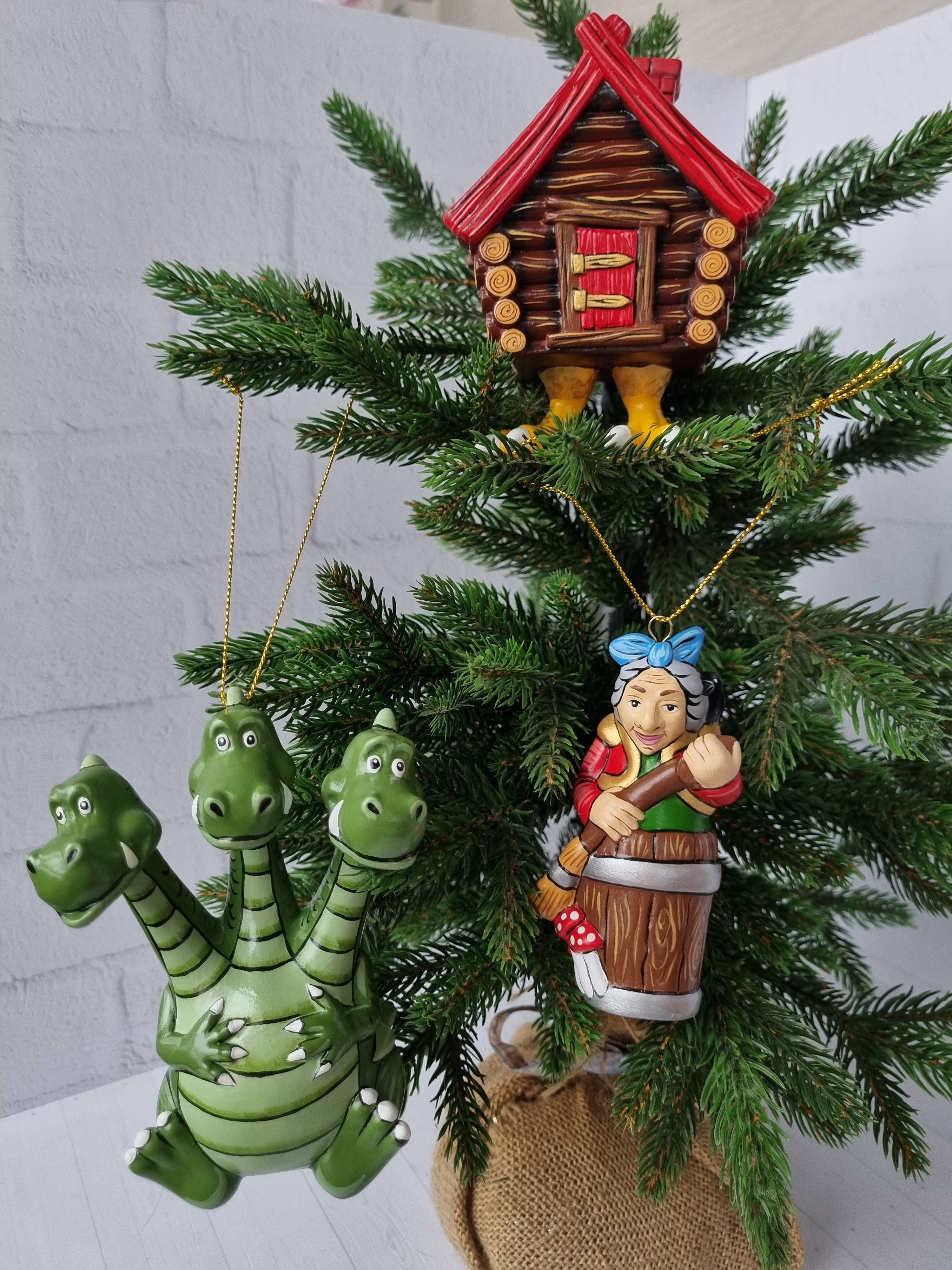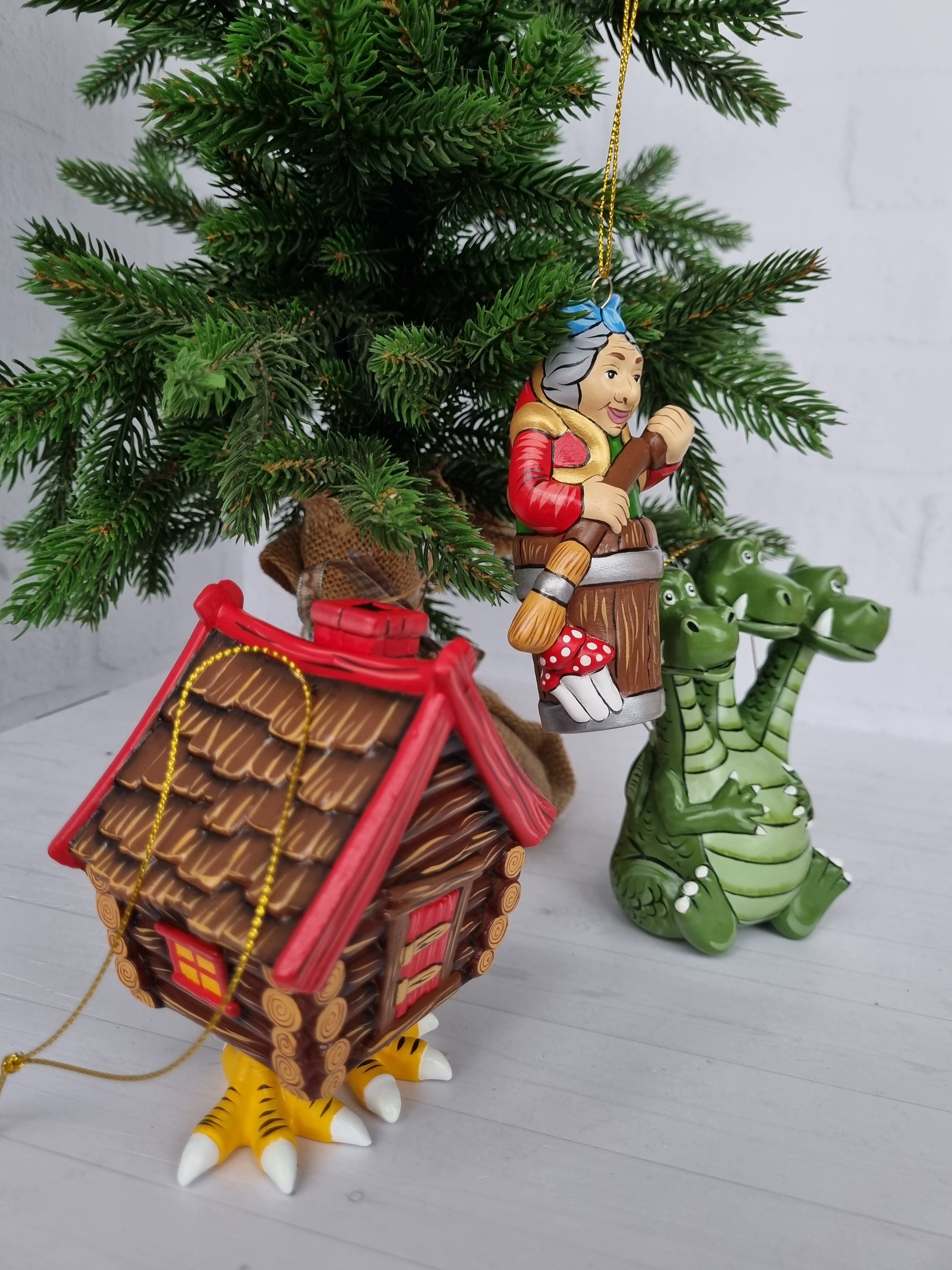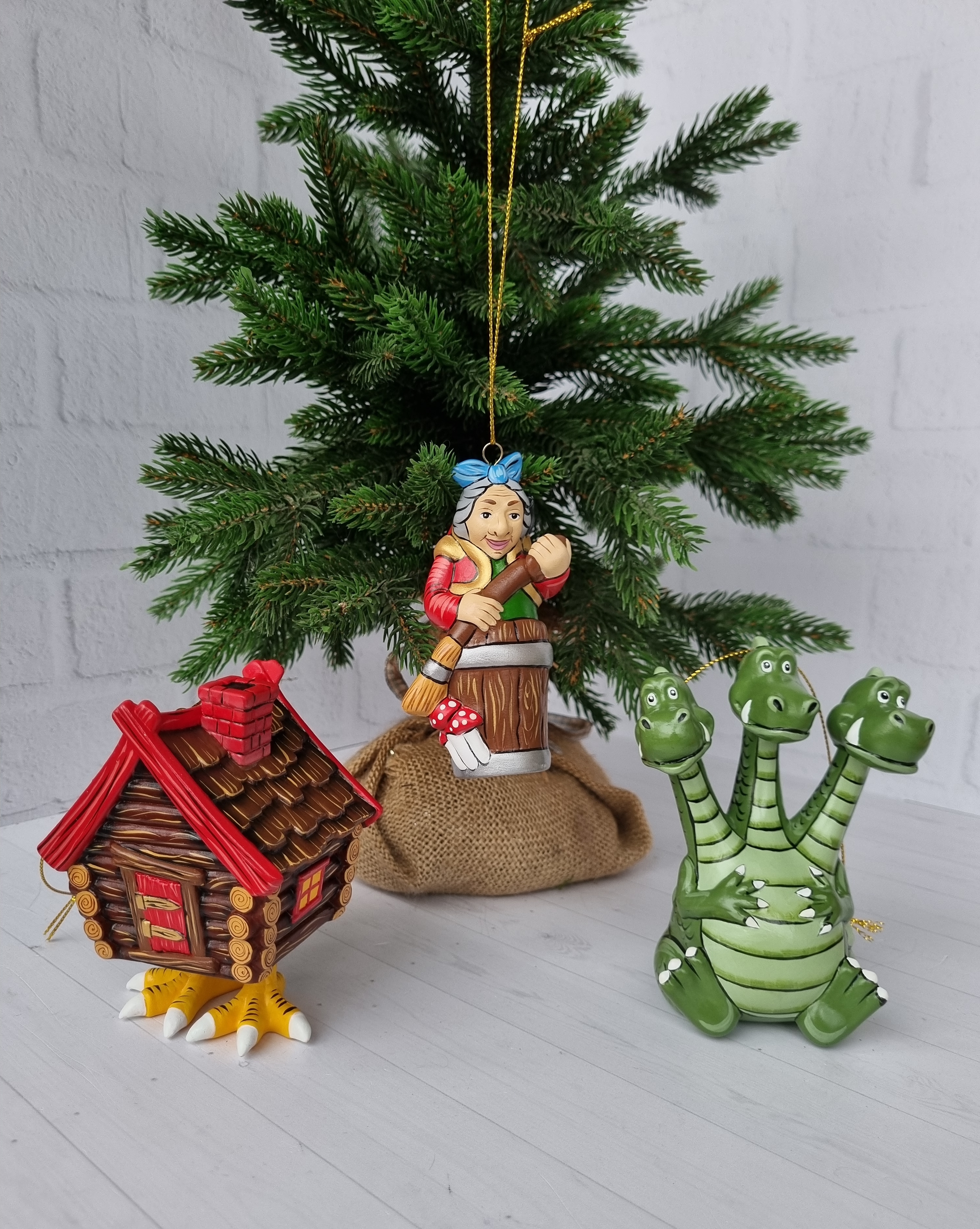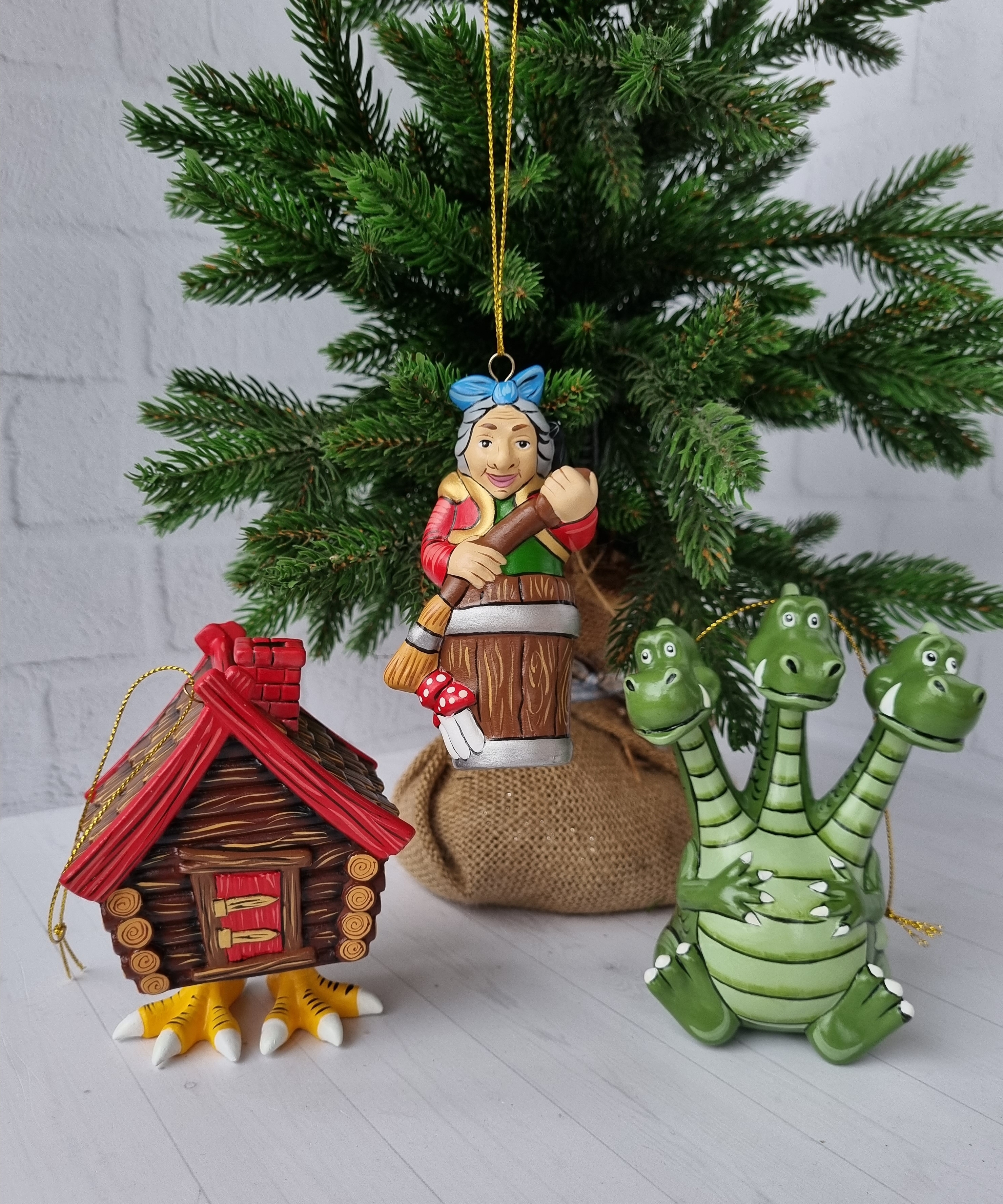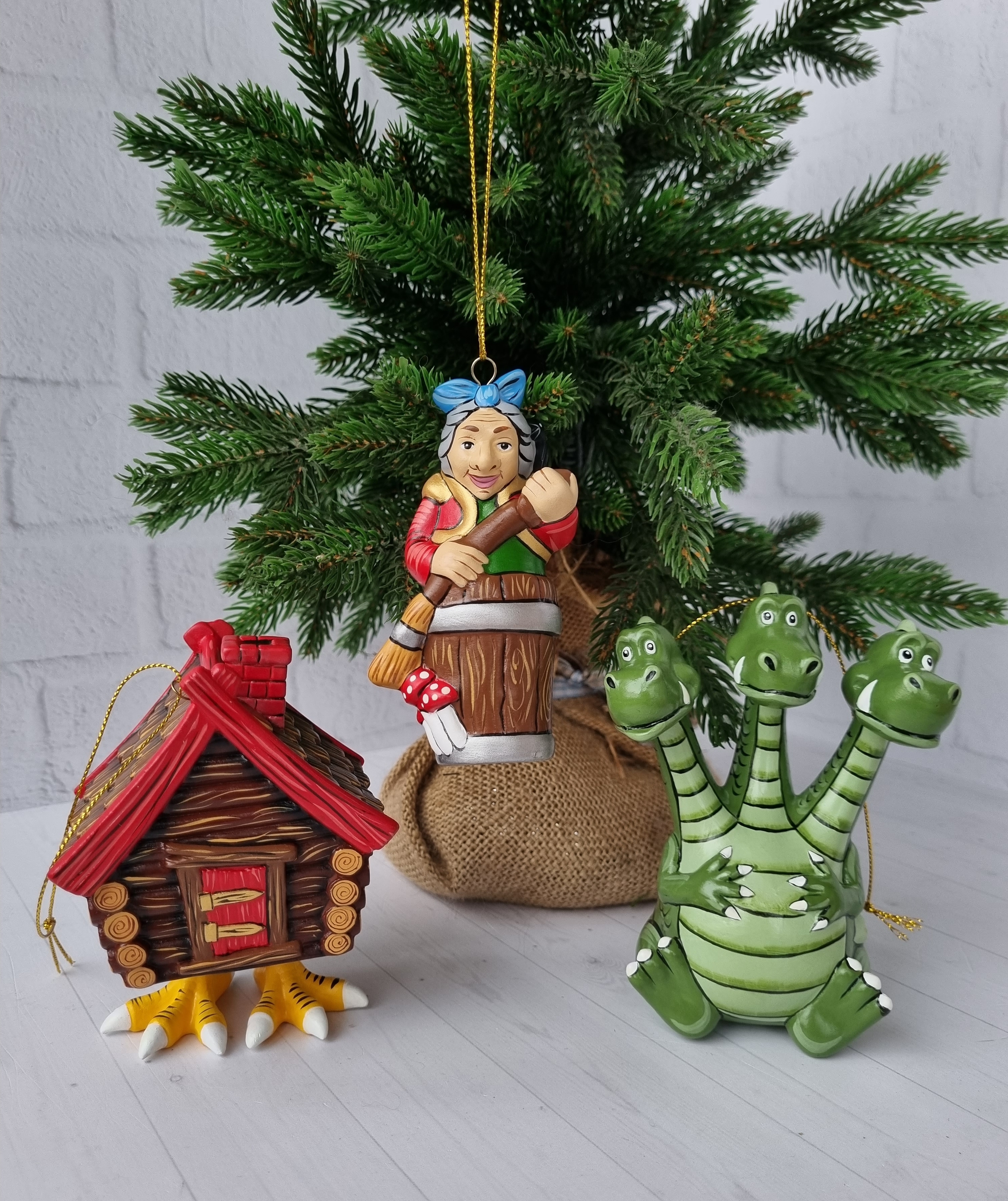 Набор игрушек на ёлку из фарфора баба-яга, змей-горыныч и избушка