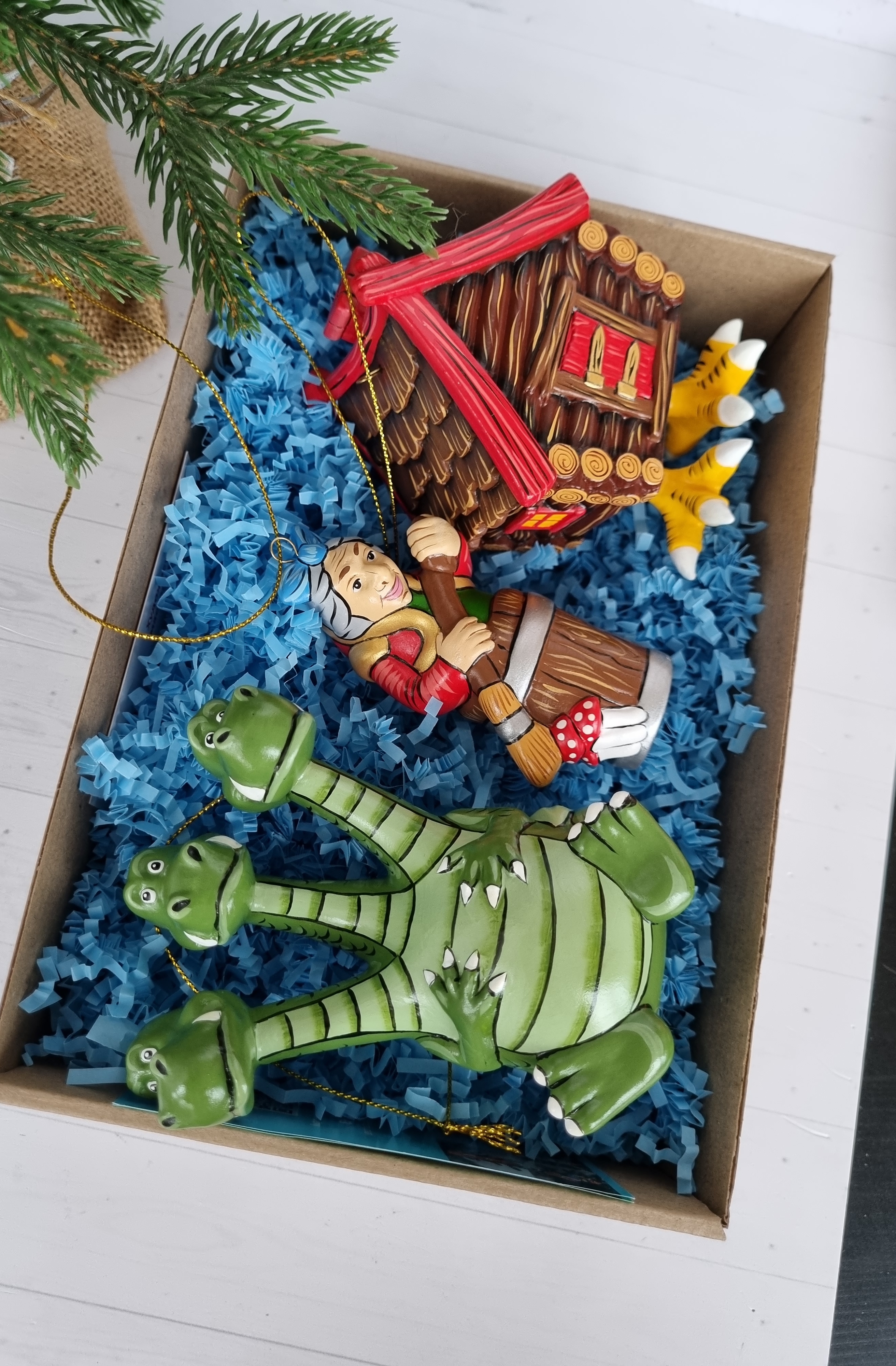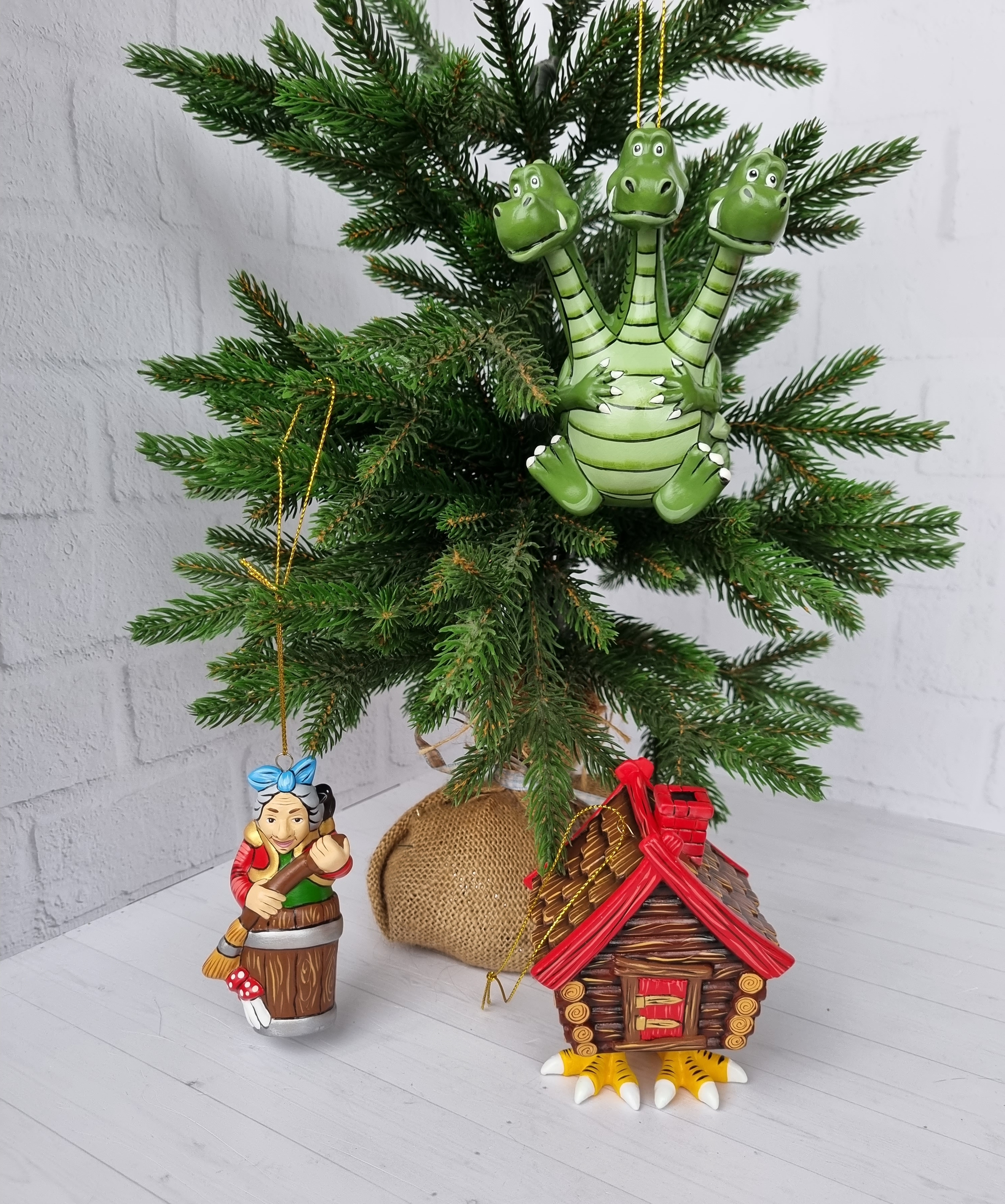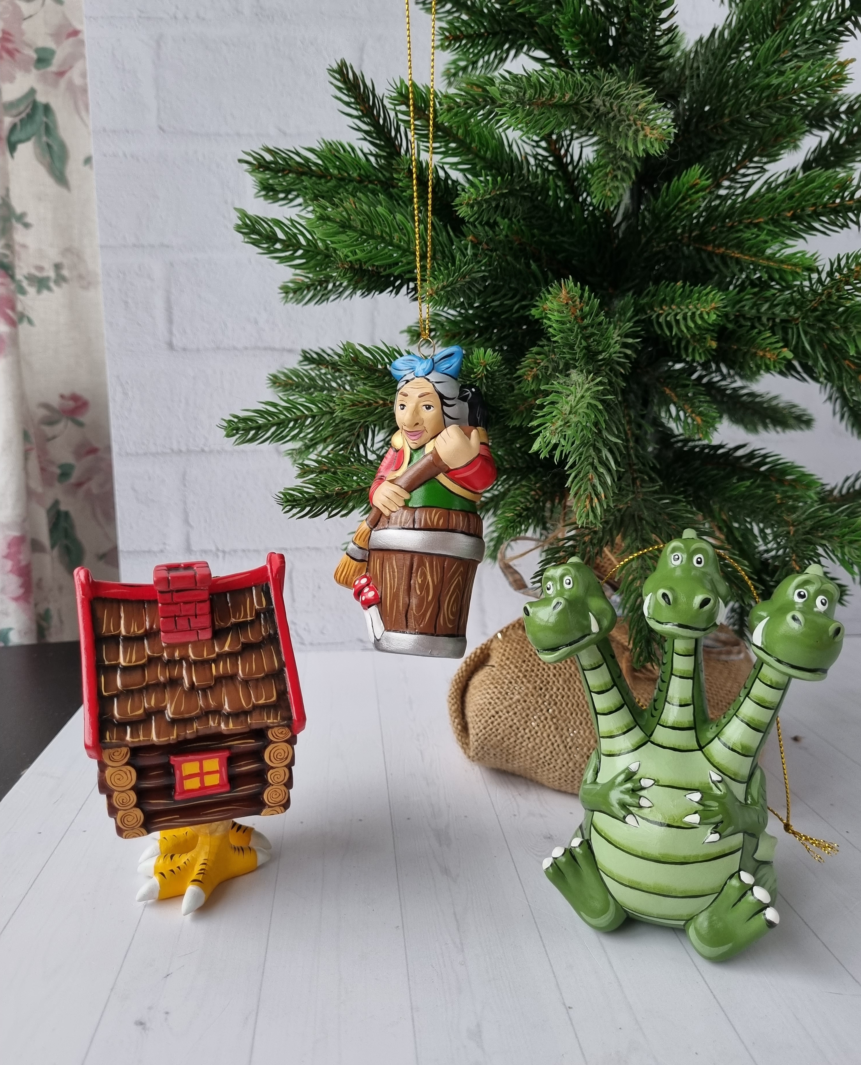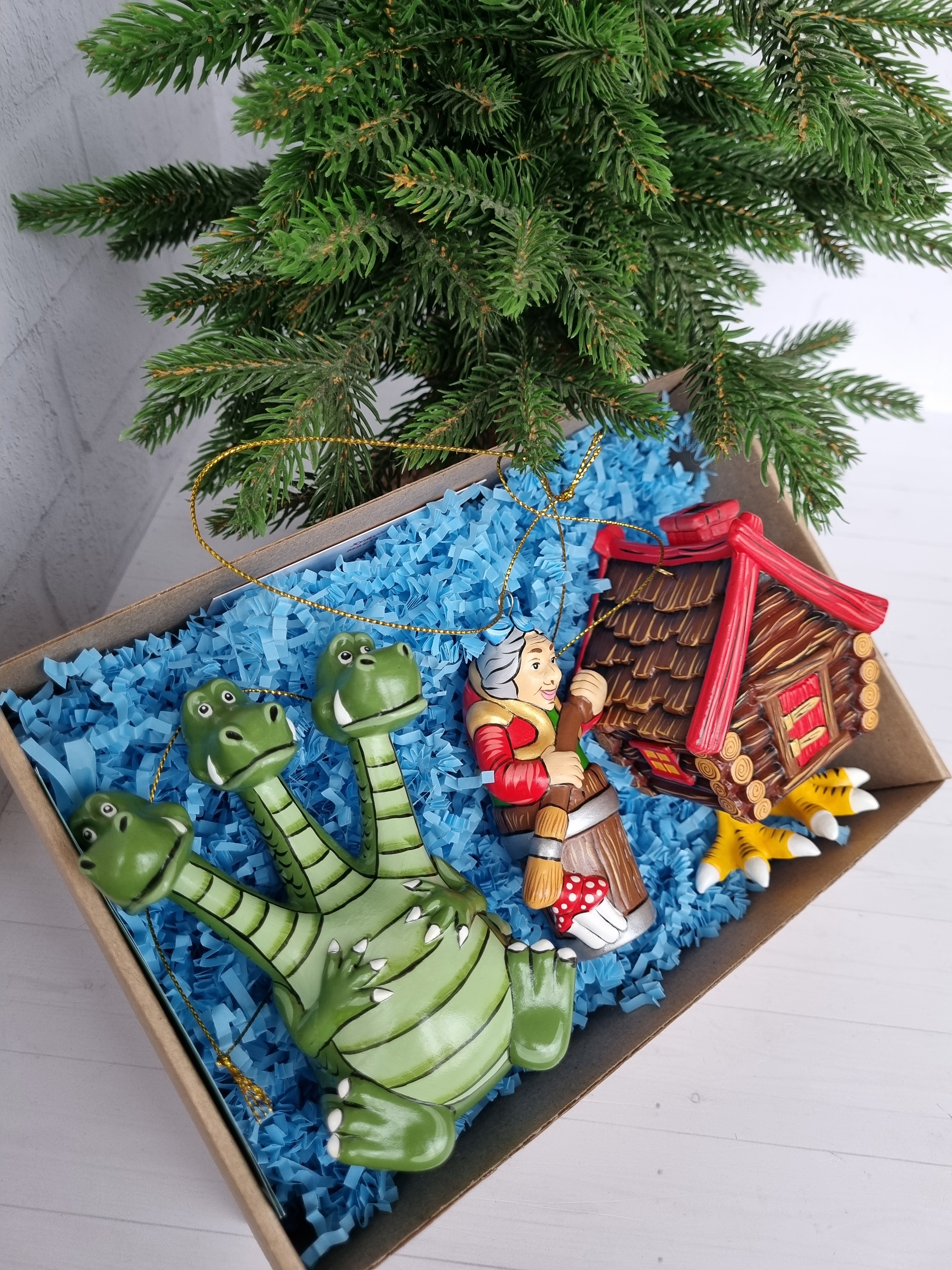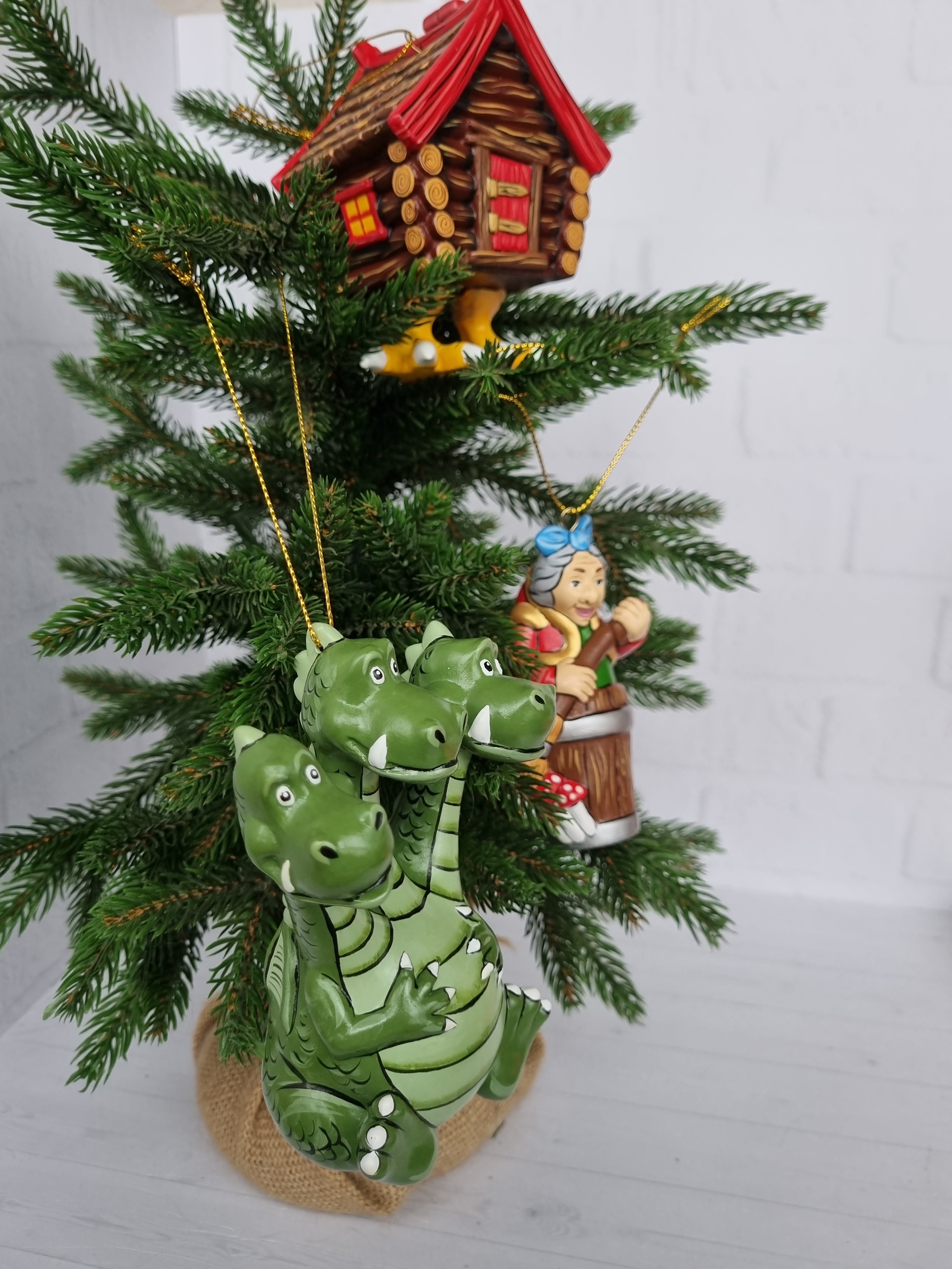 Набор игрушек на ёлку из фарфора баба-яга, змей-горыныч и избушка